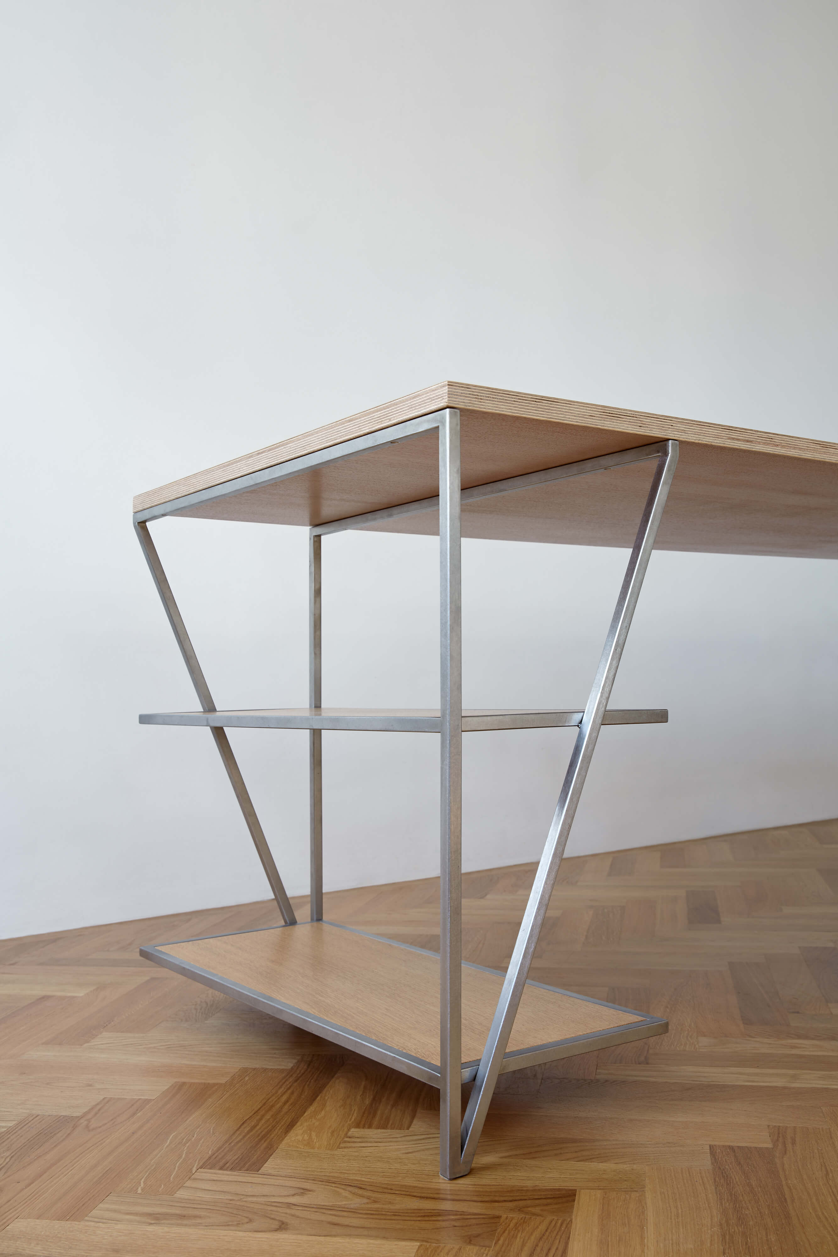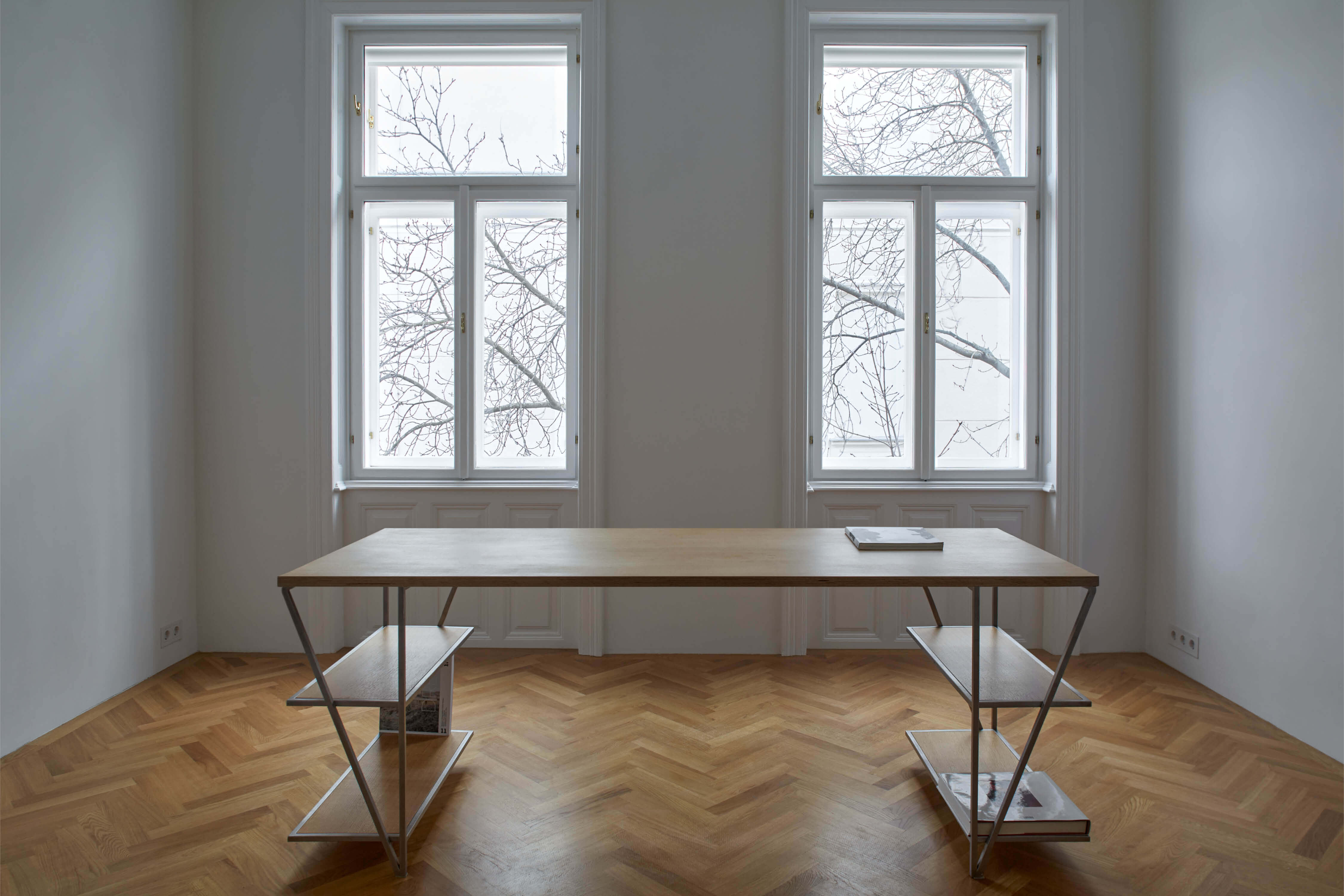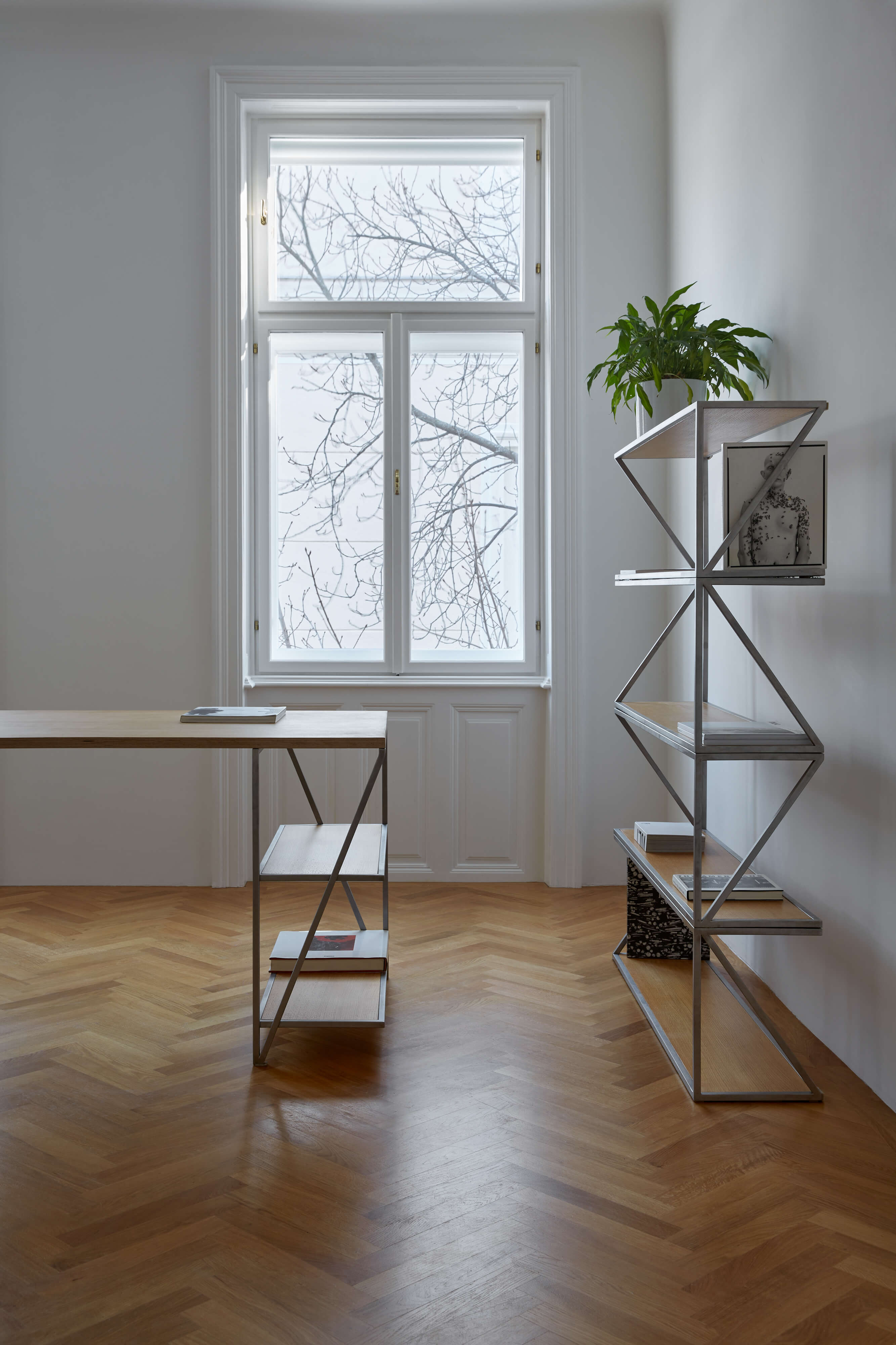 The table the shelf designed to be used as a workstation reflects the pragmatic approach of Proksa Architects. Using materials like wood and steel in a way that emphasises on their natural properties is celebrating a direct and an honest way of constructing furniture.