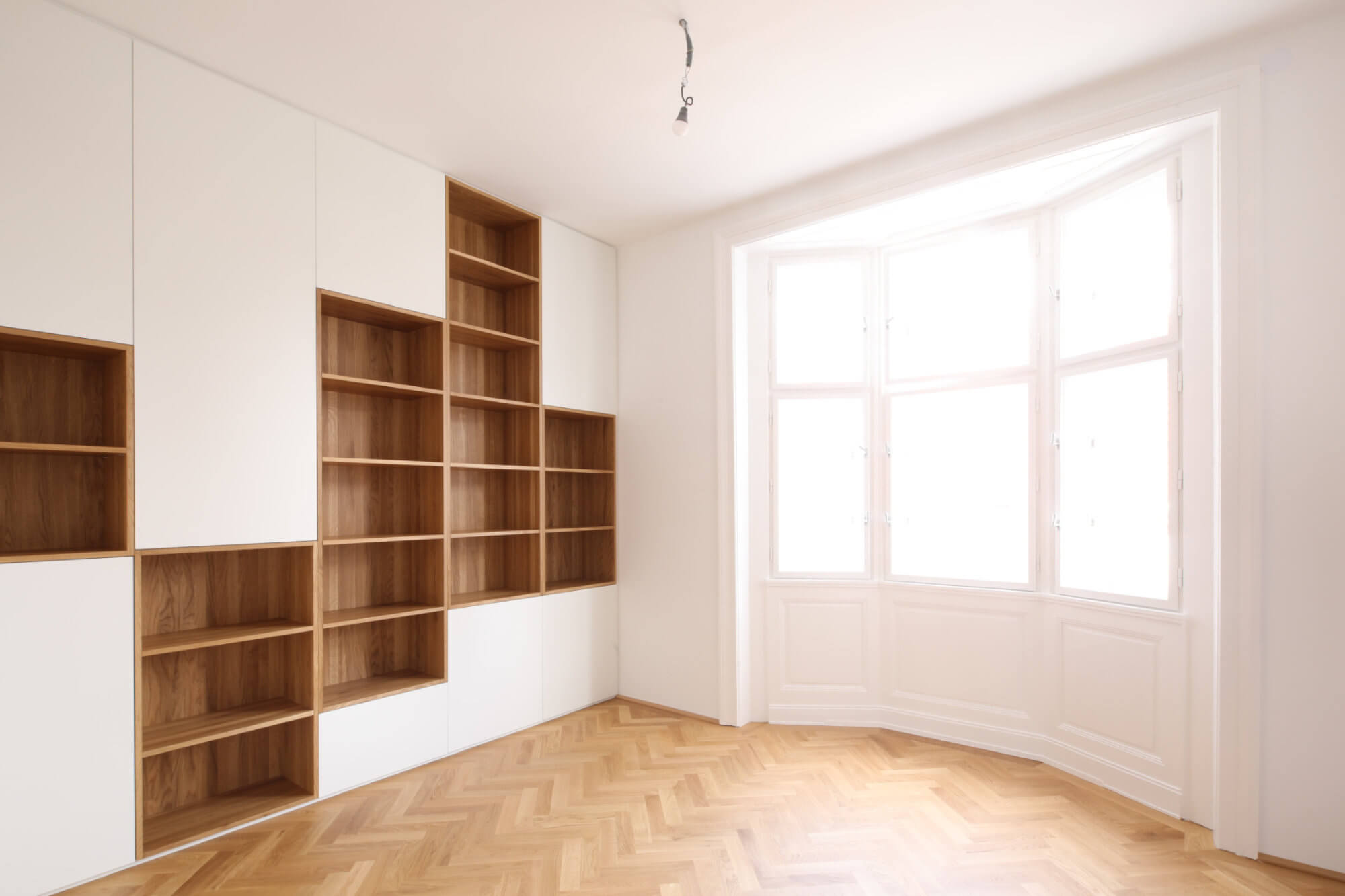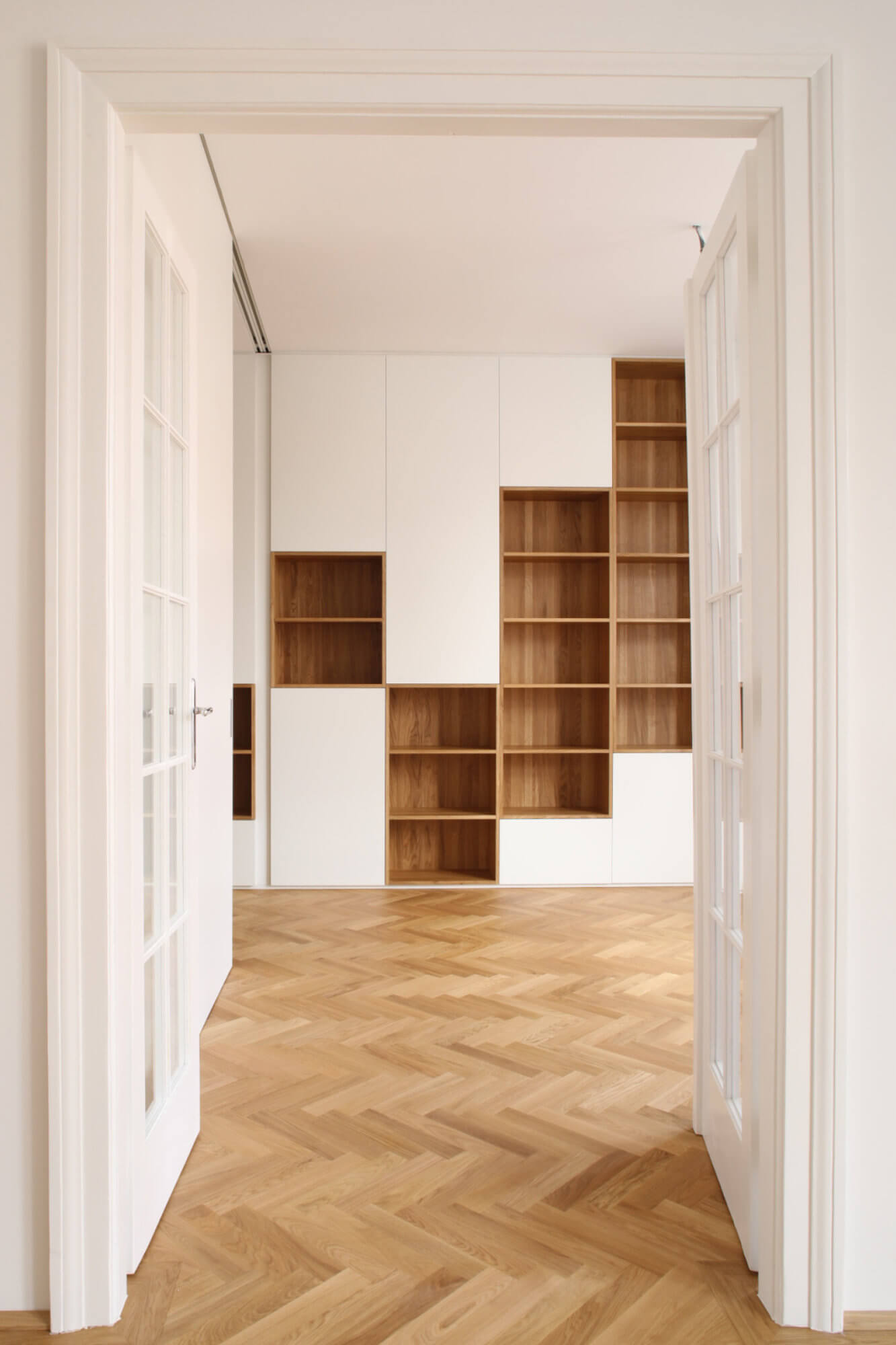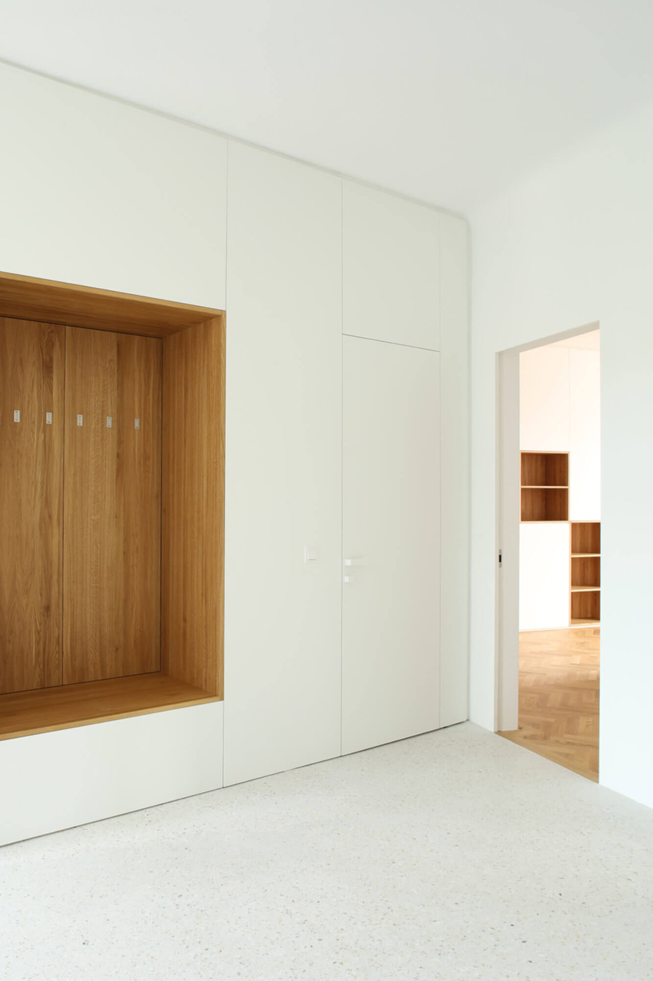 Building within the existing fabric. The renovation of a flat in the Art Nouveau house in the 4th district of Vienna is one that plays with contemporary design elements to remodel the flat. The wooden accents are well adjusted to the white elements and accentuate the form of the flat together.
