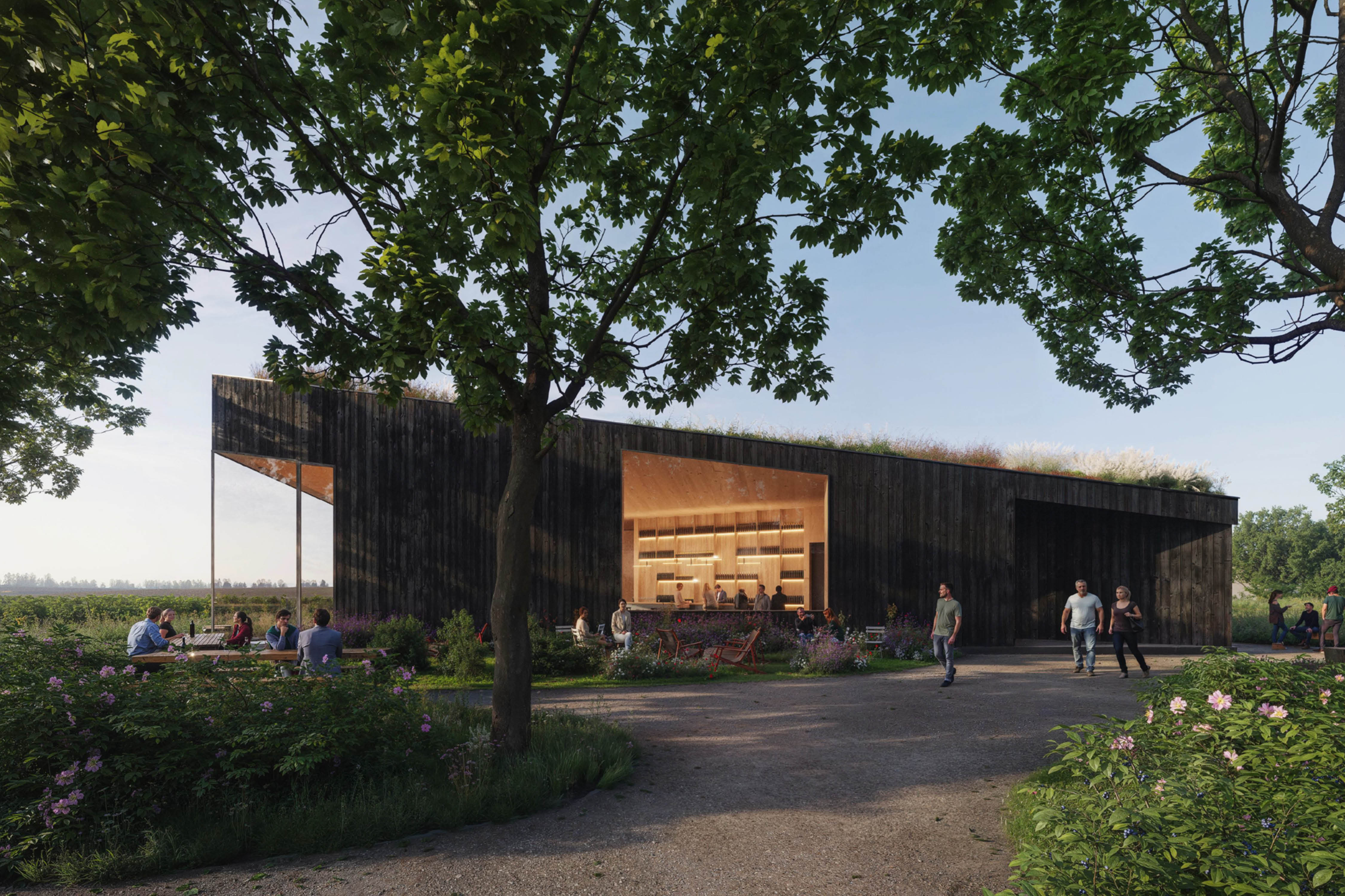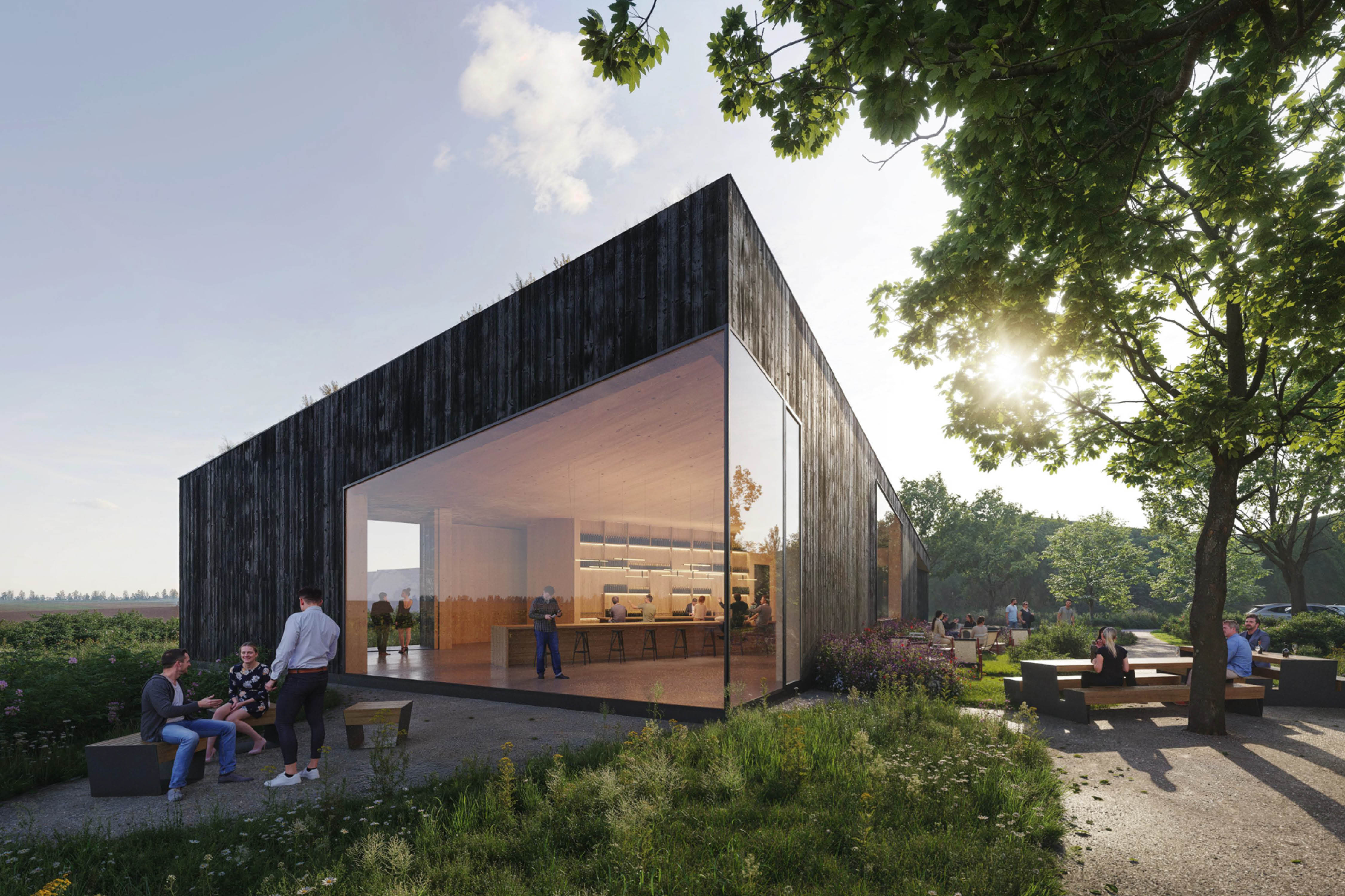 Surrounded by vineyards near the town of Velké Bílovice an additional building for an already existing winery is created. The new building accommodates new functions and enhances the overall site. The new structure integrates harmoniously into the existing ensemble of storage and production facilities while creating a distinctive venue for wine tastings and events. In addition to a spacious, flexible room for tastings and events, the building also includes a retail area and office spaces for administration. Generous openings on all sides give the structure an inviting character, strengthen the relationship between interior and exterior, and offer sweeping views of the surrounding vineyards.